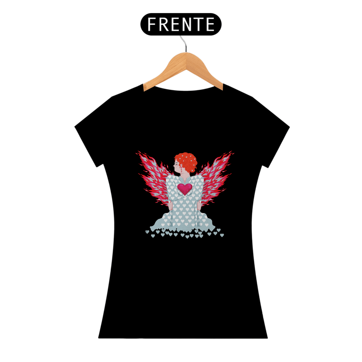 Vestir esta arte é declarar liberdade viva. As asas flamejantes celebram a força que renasce do próprio fogo; o coração exposto revela coragem emocional sem filtros; o vestido de infinitos corações espalha empatia por onde passa. Quem a usa comunica ao mundo que vive apaixonadamente, honra a própria vulnerabilidade e inspira outros a acenderem seu fogo interior para voar além de qualquer limite.