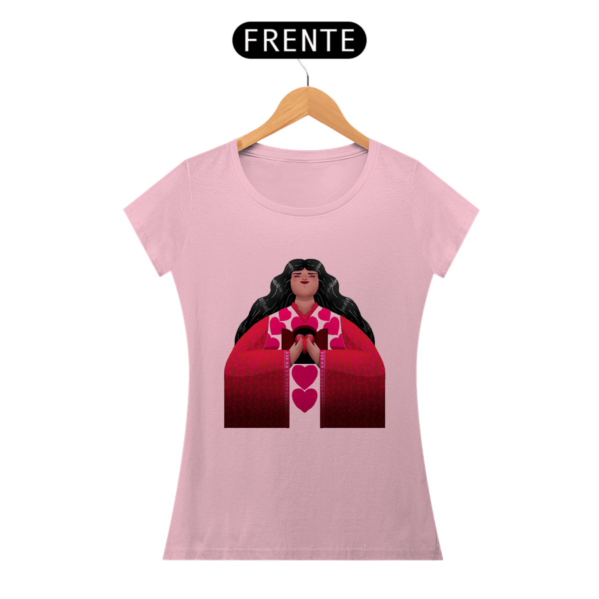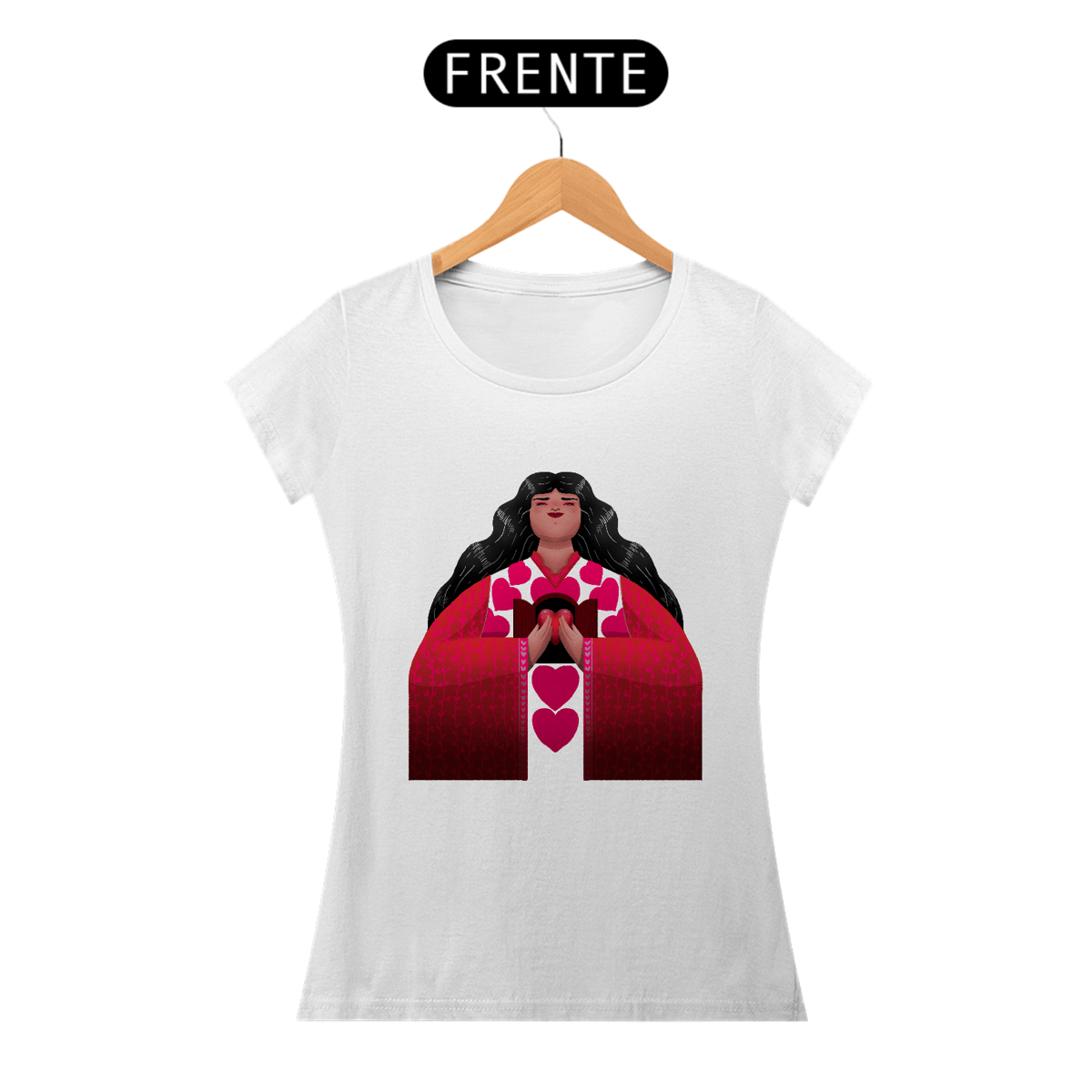 Vestir esta estampa é declarar amor-próprio em voz alta. O coração nas mãos revela cuidado ativo consigo mesma; a fileira de corações no corpo mostra que esse afeto se expande, nutrindo mente, hormônios e imunidade. O vermelho vivo e os ramos que brotam do tecido simbolizam crescimento interno contínuo. Quem a usa comunica ao mundo: “Eu me priorizo, me celebro e só transbordo depois de me encher de ternura”. Essa postura inspira quem vê a cultivar a mesma raiz de autocompaixão transformadora.